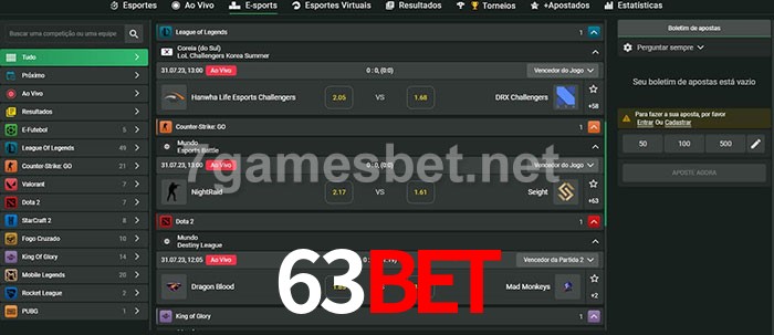 O 63Bet oferece uma grande seleção de opções de apostas em e-sports com probabilidades competitivas
